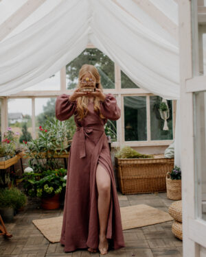 GAURI maxi -Lniana Sukienka z bufiastymi rękawami- Marsala Rose L/XL