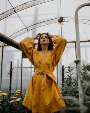 RASUL mini Lniana Sukienka Kimono- Mustard Lady
