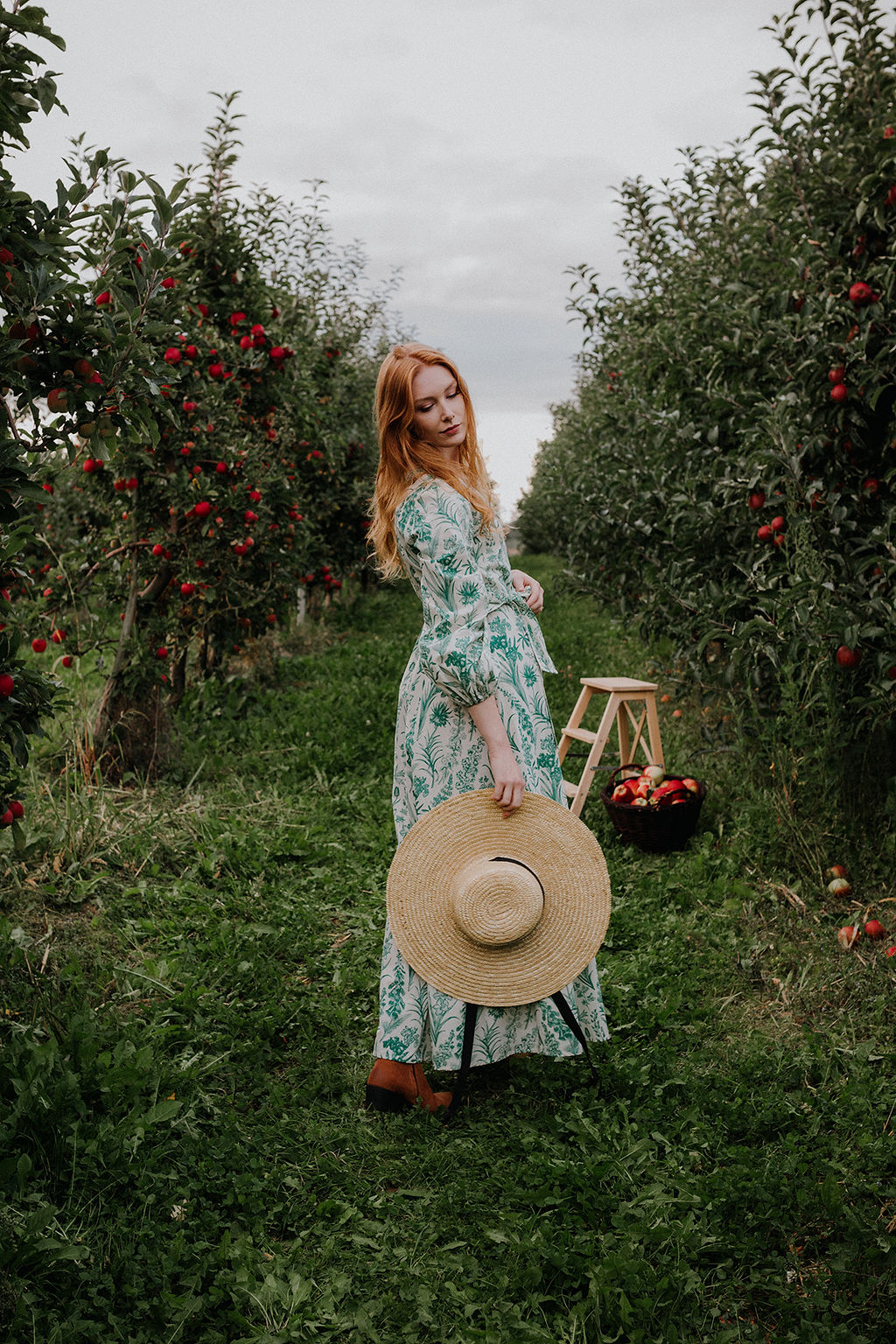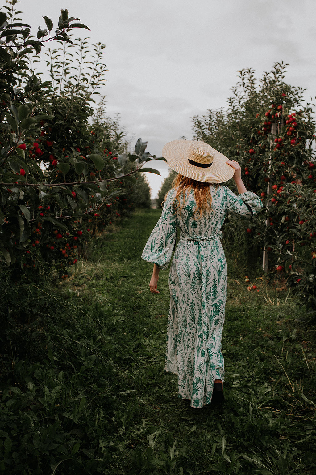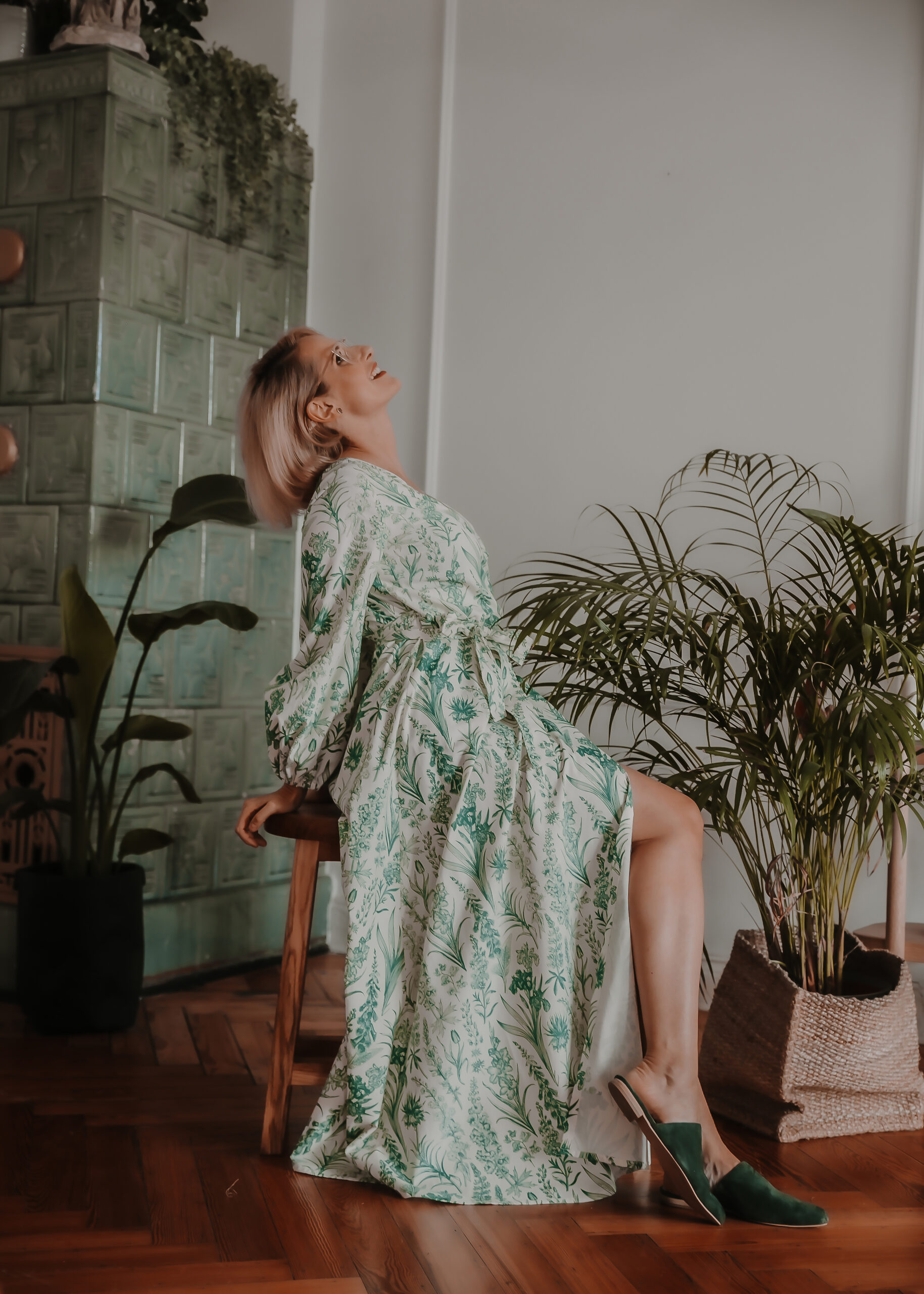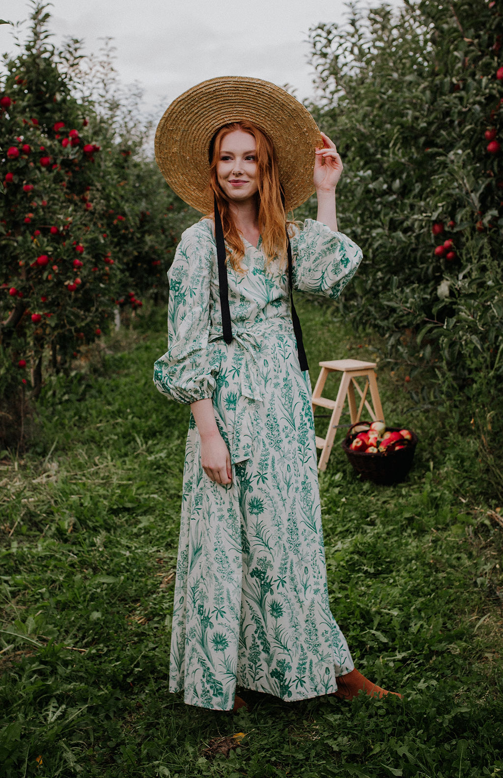 GAURI Plants Lady – to bawełniana sukienka maxi z cudownym printem roślinnym w kolorze butelkowej zieleni.