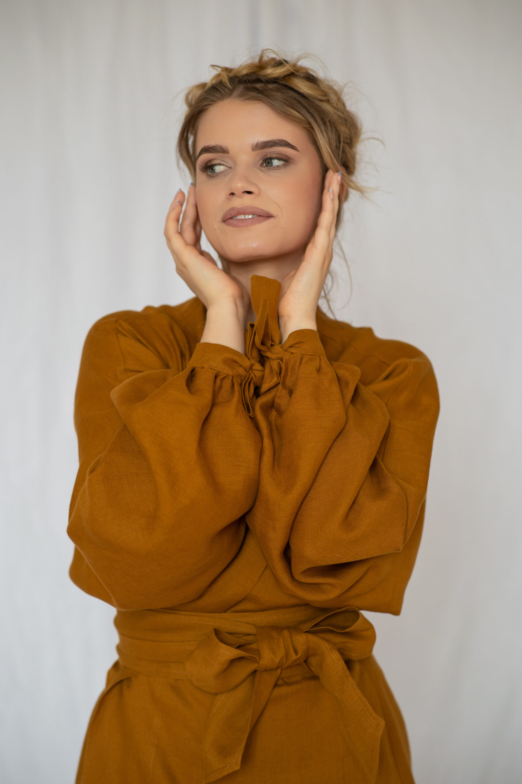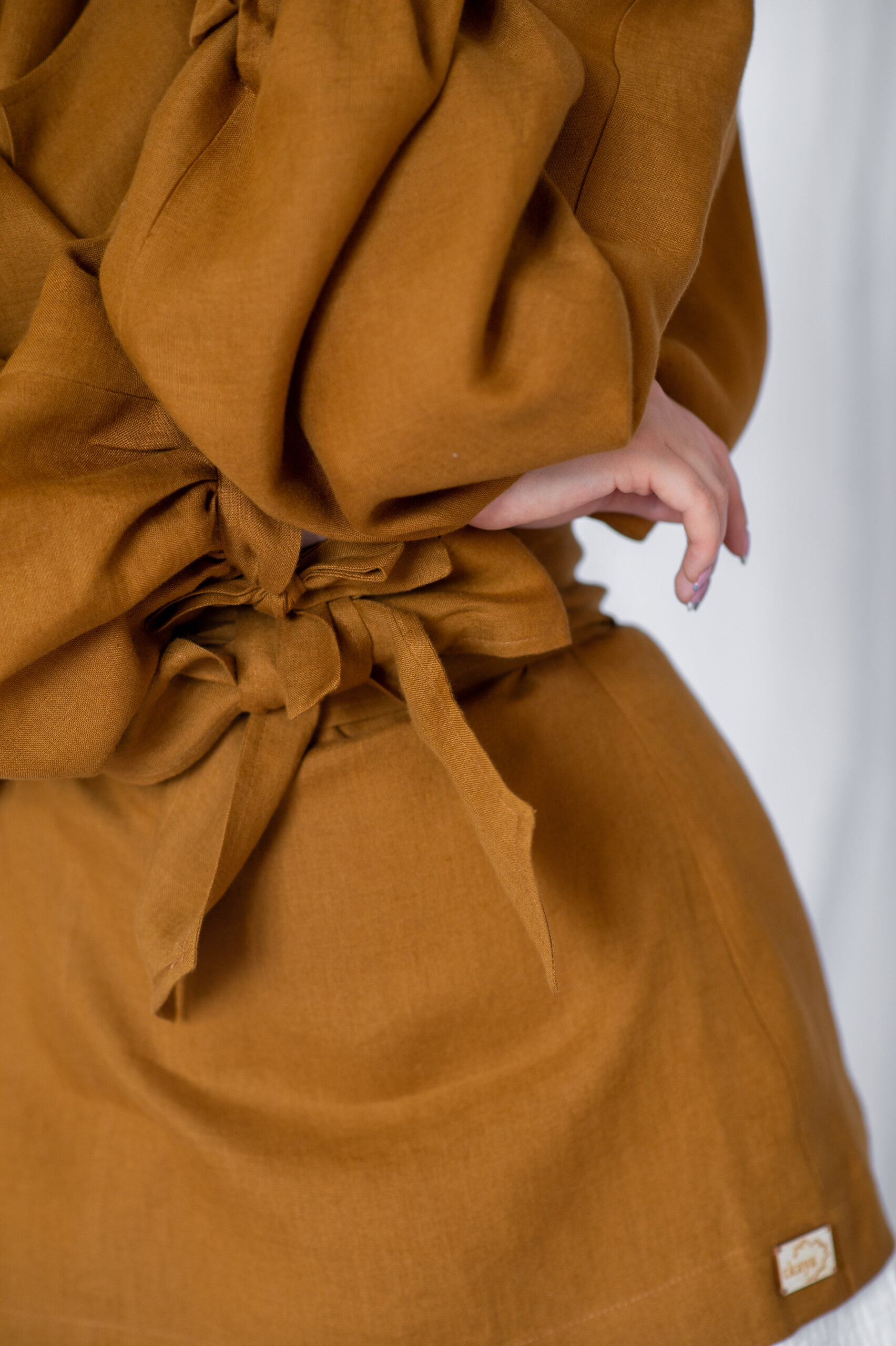 SATYA to lniana koszula z wiązanymi rękawami o kroju kimono. Szerokie i długie rękawy posiadają wiązane troczki przy nadgarstkach lub gumkę ( do wyboru).