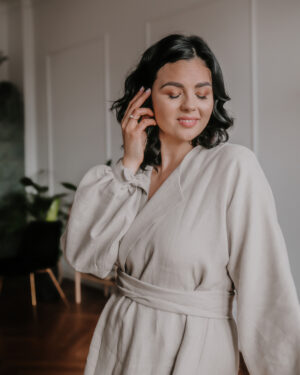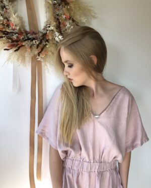 W pasie wiązana długim paskiem, który możesz luźno puścić lub zawiązać w bardziej elegancką ale jednocześnie subtelną kokardkę.