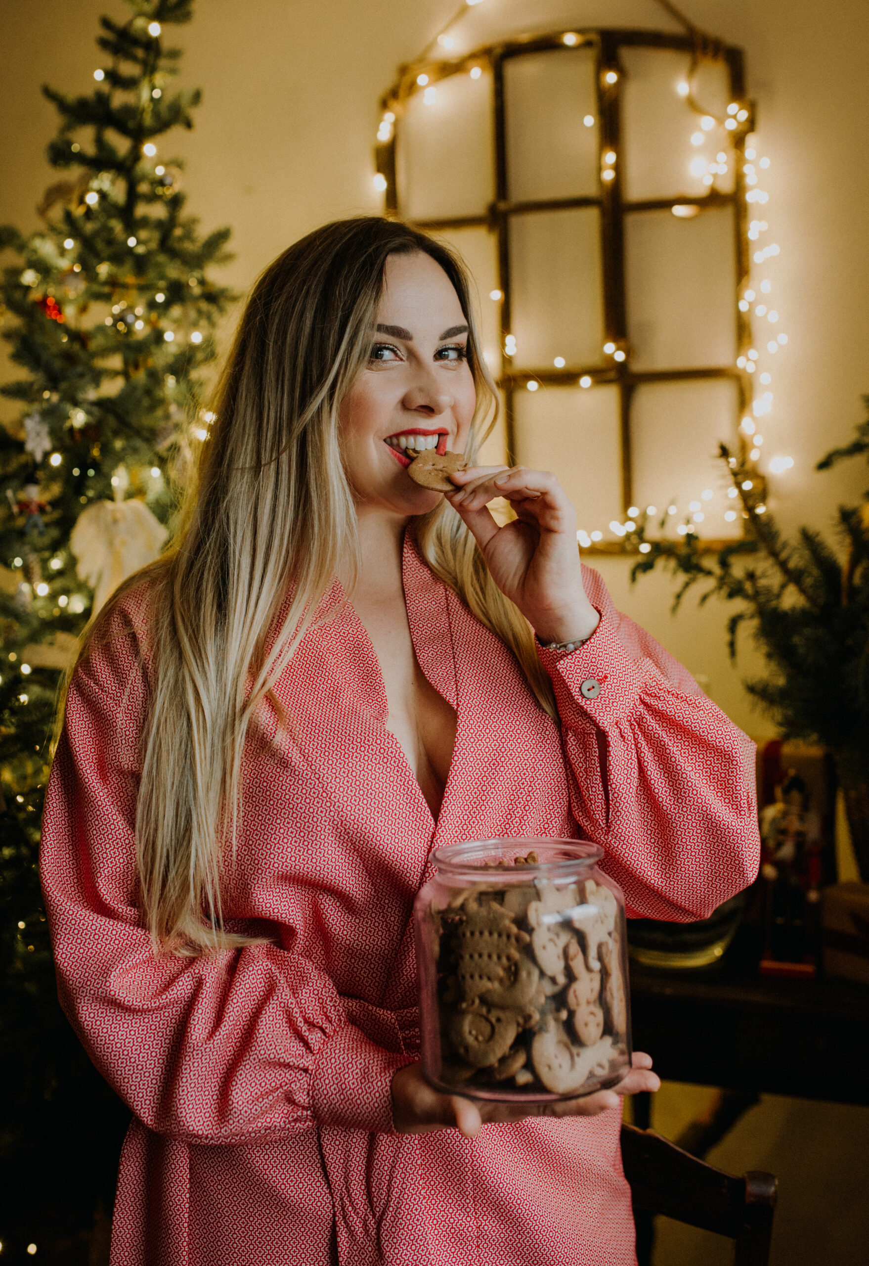 Modelka z blond włosami nosi na co dzień rozmiar L/XL i mierzy 173cm wzrostu.