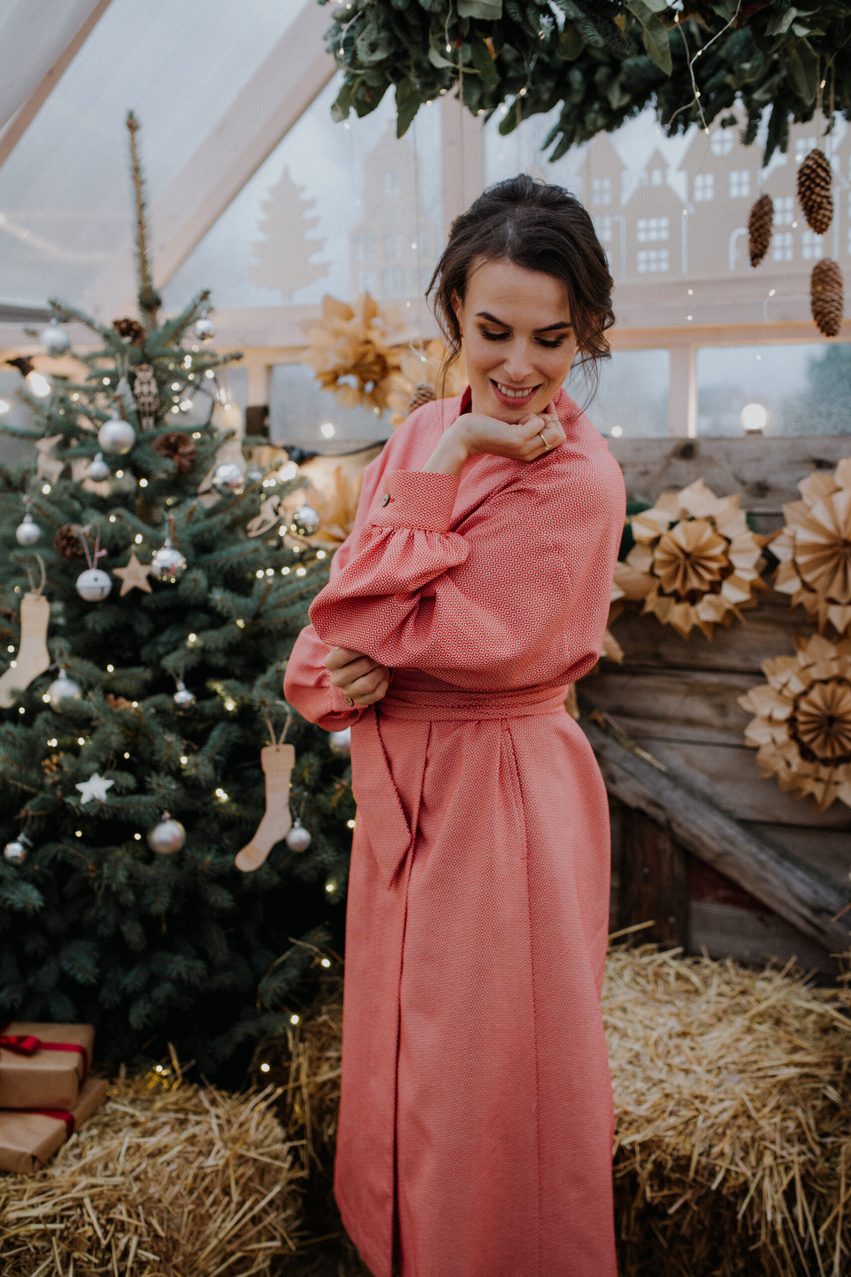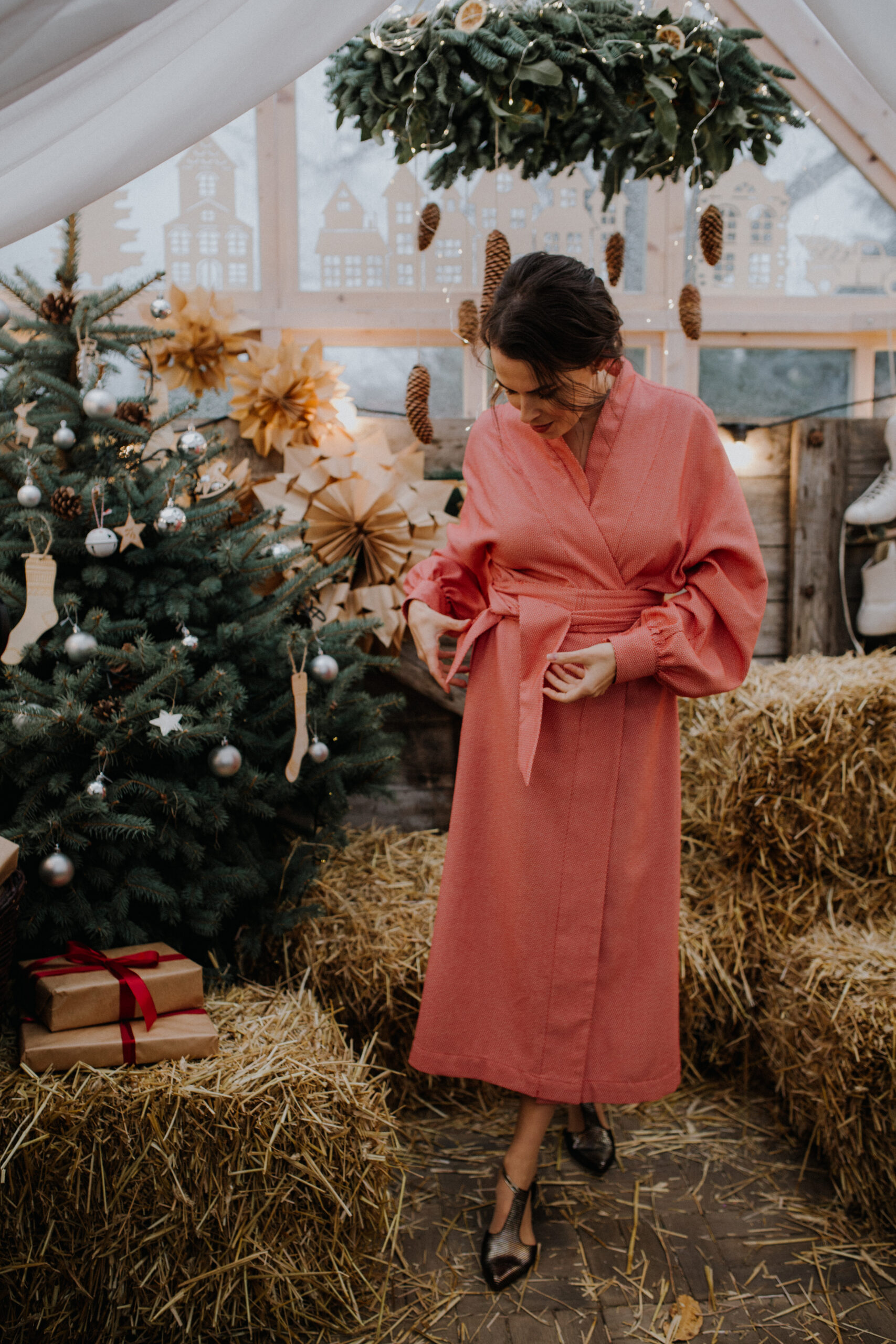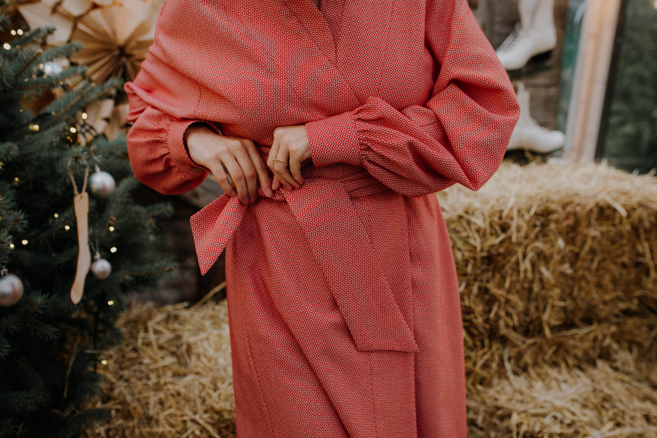 Eleganckie wykończenia, mankiety z kokosowymi zapięciami, kobiecy dekolt, długi pas do zawiązania, wszyte po obu stronach, wewnętrzne kieszenie, czyli wygoda i styl w jednym projekcie.