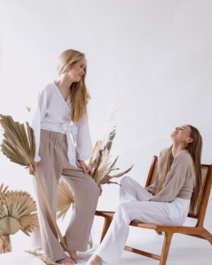 Długie, muślinowe spodnie z kantem -Creamy Beige S/M